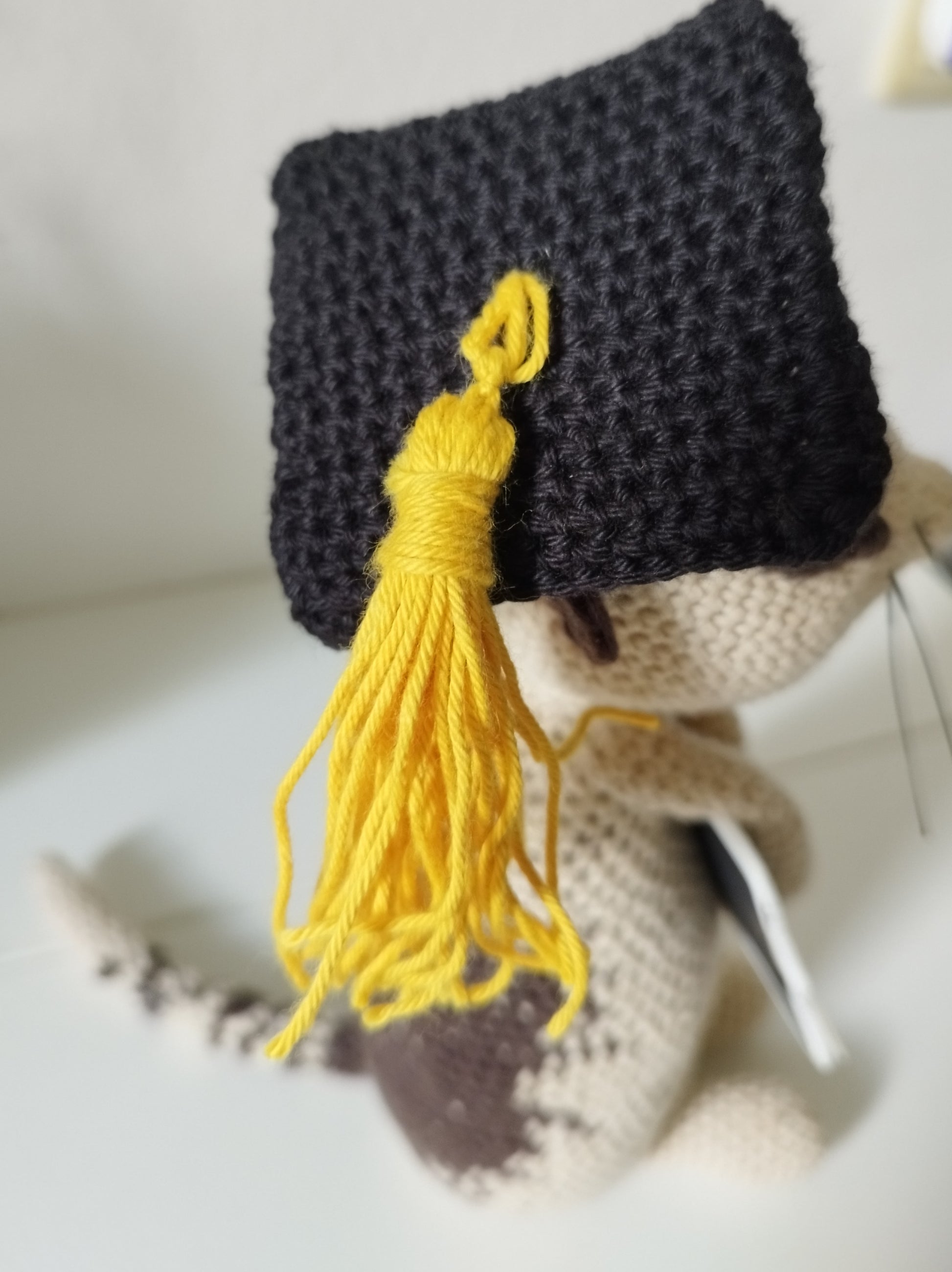 Als ich fast fertig war fragte mein Sohn: "Und wo ist der Hut?" So ist die Idee entstanden Lionel ein kleines Akademikerhütchen zu verpassen. Die Tafel dazu ist aus einer spontanen Idee entstanden.
