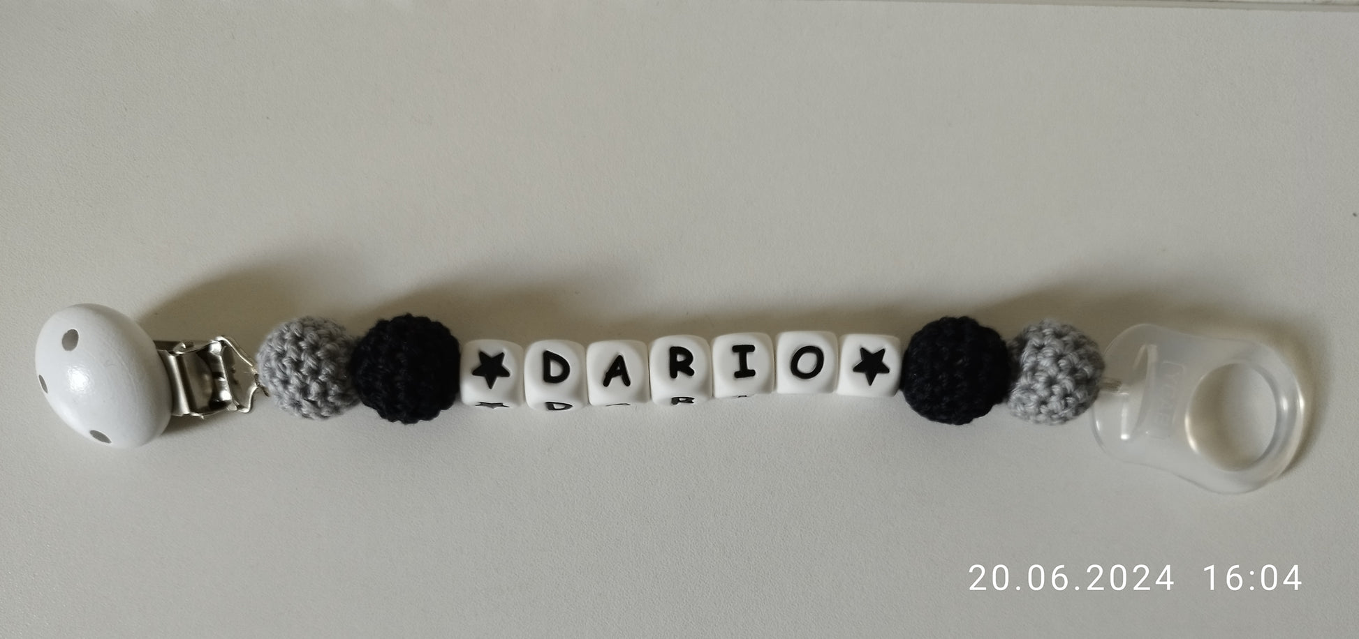 Name wahlweise mit Holz- oder Silikonperlen. Max. 7 Buchstaben (nur deutsches Alphabet, keine Sonderzeichen, keine Umlaute). Sollte der Name länger sein, müssen andere Elemente ausgelassen werden um die Länge beizubehalten.